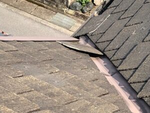 金属製の棟板金や谷板金は、屋根の中でも特に雨水が集まりやすい部分に設置されています。そのため劣化が早く、錆や穴あきが進行すると雨漏りの大きな原因になります。また、釘の浮きや抜けによって板金自体が浮き上がると、強風時に飛散する危険性が高まります。