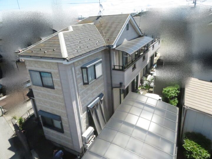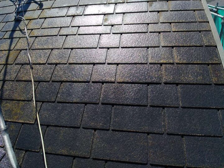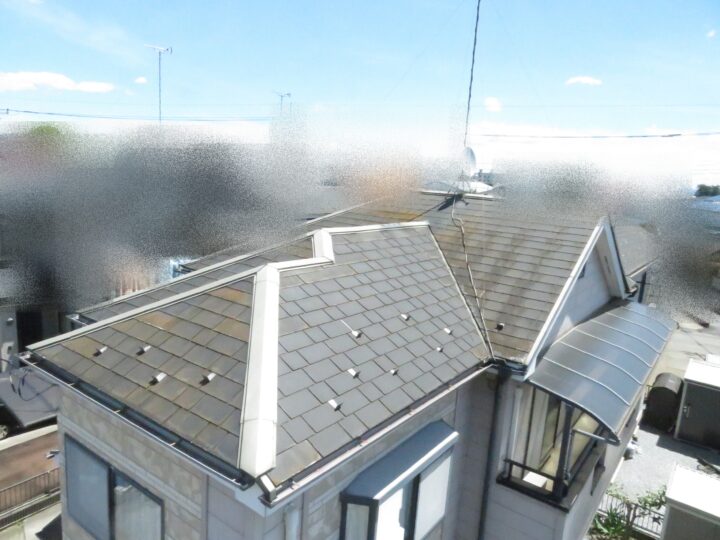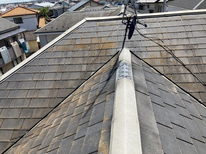 スレート屋根です。石質の薄い板を使用しているため、劣化や反りがしやすい材料です