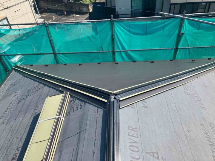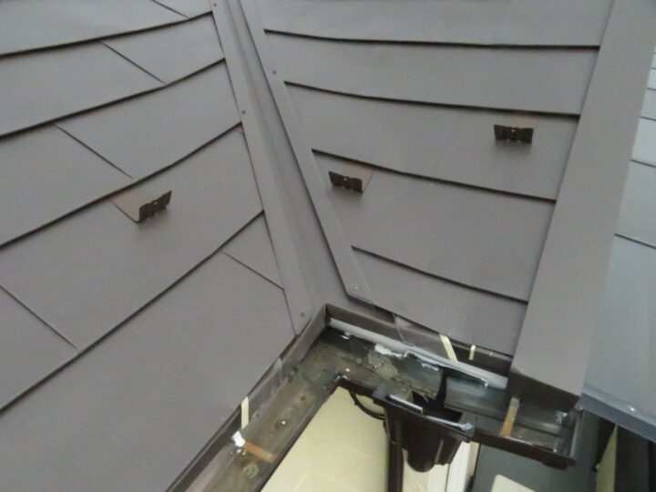 5箇所ある谷板金の内4箇所がズレてしまっている状態です。ズレ幅が大きいため、重なっている部分の残りが少ない場合は雨漏りに繋がる可能性がございます。