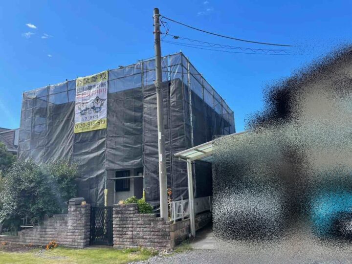 • 足場の組立・メッシュシートの取付が完了しました。安全且つご近所様への配慮になります。