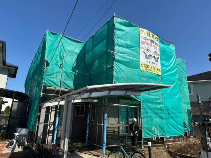 • 足場の組立・メッシュシートの取付が完了しました。安全且つご近所様への配慮になります。